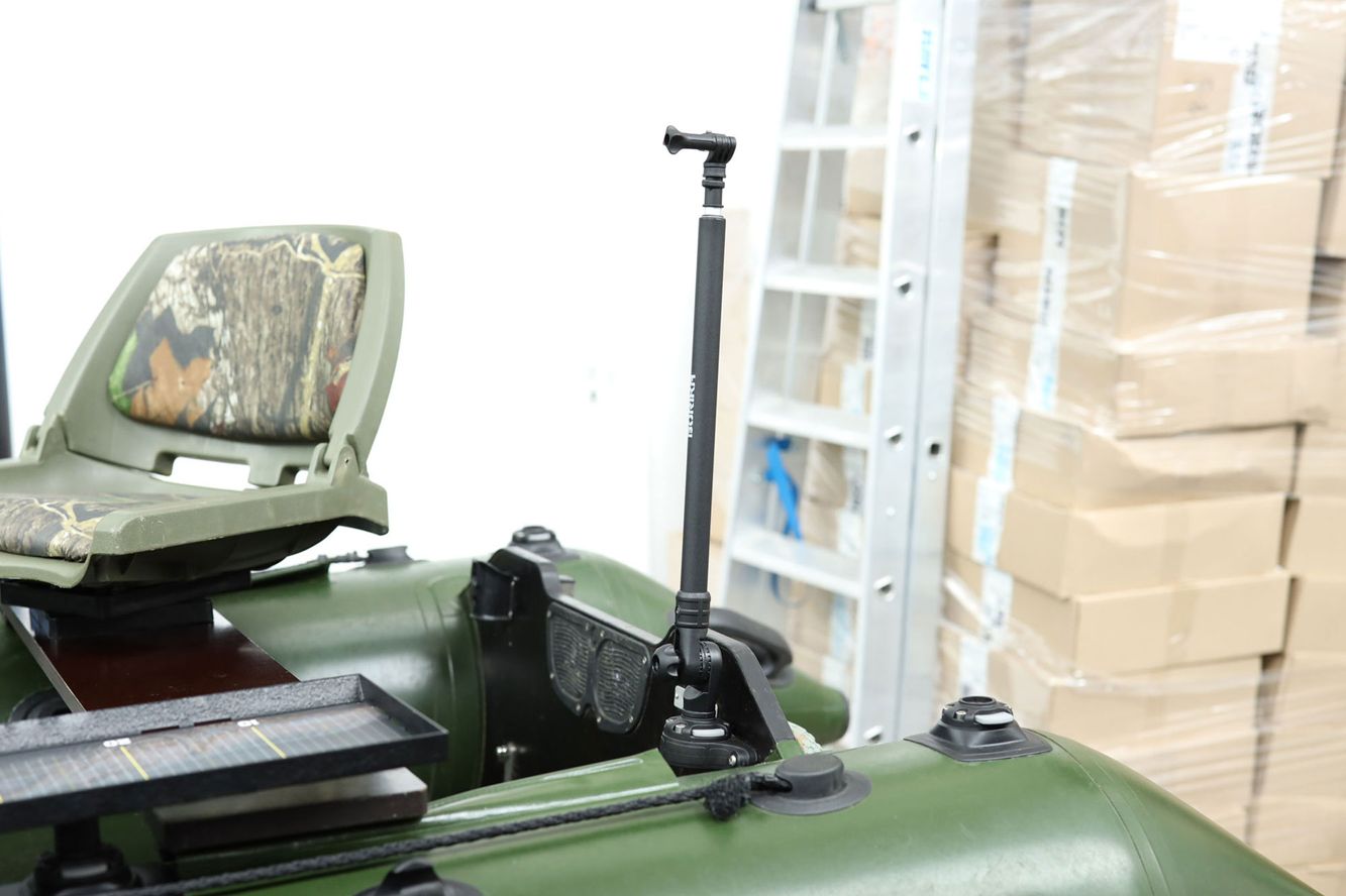 Die Halterung wurde speziell für die horizontale Montage an senkrechten Flächen deines Bootes entwickelt. Sie lässt sich mit den mitgelieferten selbstziehenden Schrauben mühelos auf Holz befestigen. Zudem kann sie auf stabilen Oberflächen wie Aluminium oder GFK-Booten sicher verschraubt werden. Bei Schlauchbooten wird sie häufig am Heckspiegel montiert.